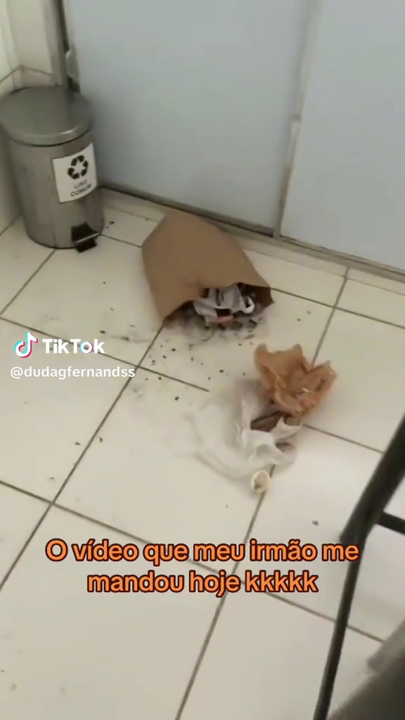 “Amorinha, foi você quem mexeu no lixo? Foi você que jogou o lixo no chão? Eu tô achando que foi você, Amorinha”, fala o homem aos risos.