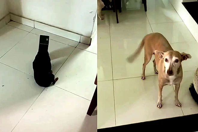 Ao mesmo tempo, a cachorrinha parece balançar a cabeça em uma negativa, bem sendo pega com a faca e queijo na mão — ou melhor — com uma caixa que foi jogada no lixo.