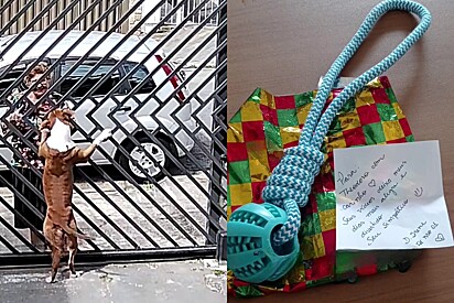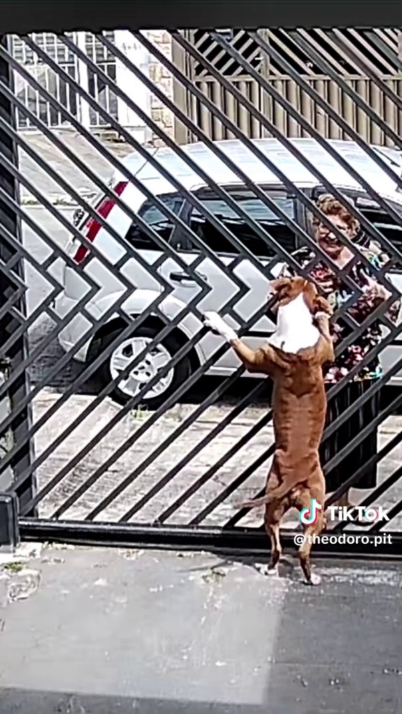 Poucos instantes depois a avó humana do pitbull aparece no portão para receber o pacote. O cão fica mais feliz ainda quando vê que seu novo brinquedo está ao seu alcance.
