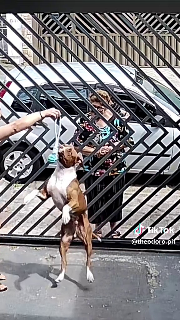 Mas no momento em que mostra que está carregando um presente, o pitbull pula de maneira frenética tentando alcançar o objeto, mas é impossível, pois a amiga sabe que precisa entregar a um humano.