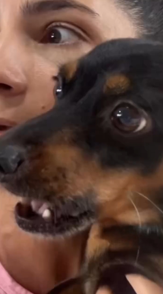 Teddy, com sua expressão de poucos amigos, apenas a encara e começa a rosnar, o que já é suficiente para arrancar gargalhadas de quem assiste.