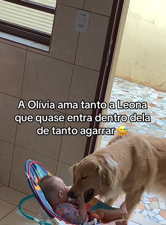 Apesar de ser grandona e ter um jeitinho desengonçado, Leona sabe ser gentil e cuidadosa com a Olívia — chegando a surpreender pela delicadeza com que se aproxima e interage com a bebê.