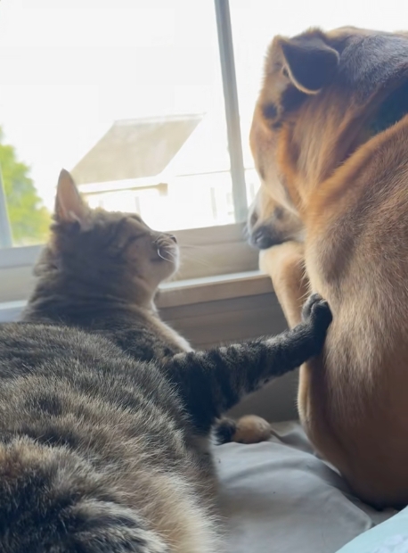 Às vezes, tudo o que a gente precisa é de alguém que simplesmente sente ao nosso lado em silêncio. E o cachorro Ollie tem a sorte de contar com sua irmã felina.
