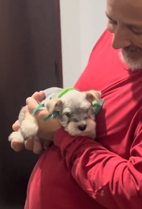 Ao abrir, encontrou um filhote de schnauzer pequeno, assustado, mas pronto para receber o colo quentinho e o amor que estavam reservados para ele.