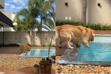 O detalhe é que Alfredo tem uma piscina em casa. E mesmo quando sua tutora pede que ele não entre, ele até disfarça, dá uma volta, finge que vai obedecer… mas não adianta. O instinto fala mais alto, o salto é certeiro e o tchibum está garantido.