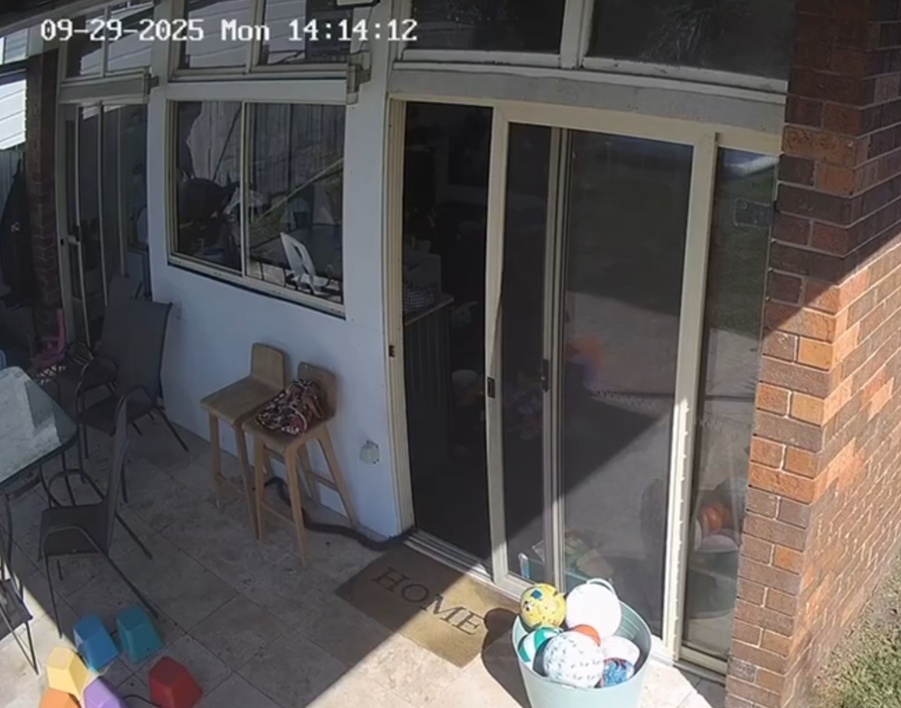 A câmera de segurança flagrou o momento em que uma cobra-preta-de-barriga-vermelha entrou pela porta de correr deixada aberta nos fundos da casa.