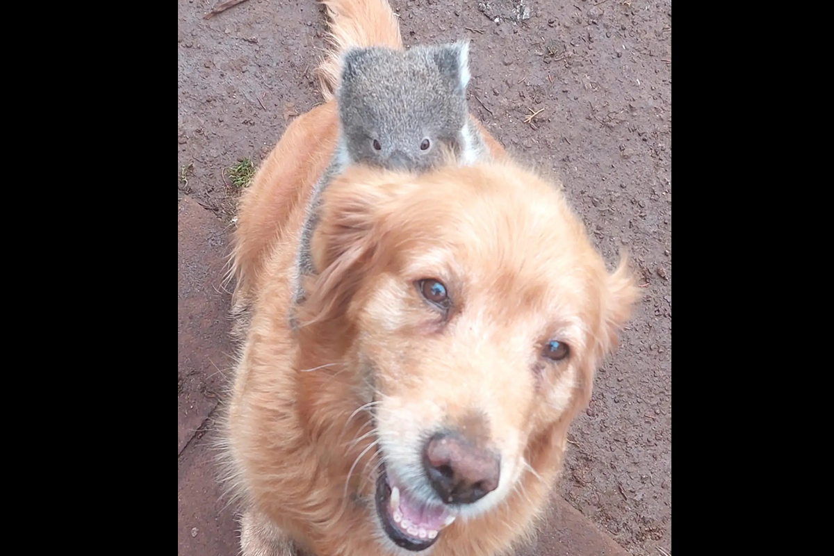 Homem sai de casa e vê filhote muito diferente montado nas costas de seu cão golden retriever
