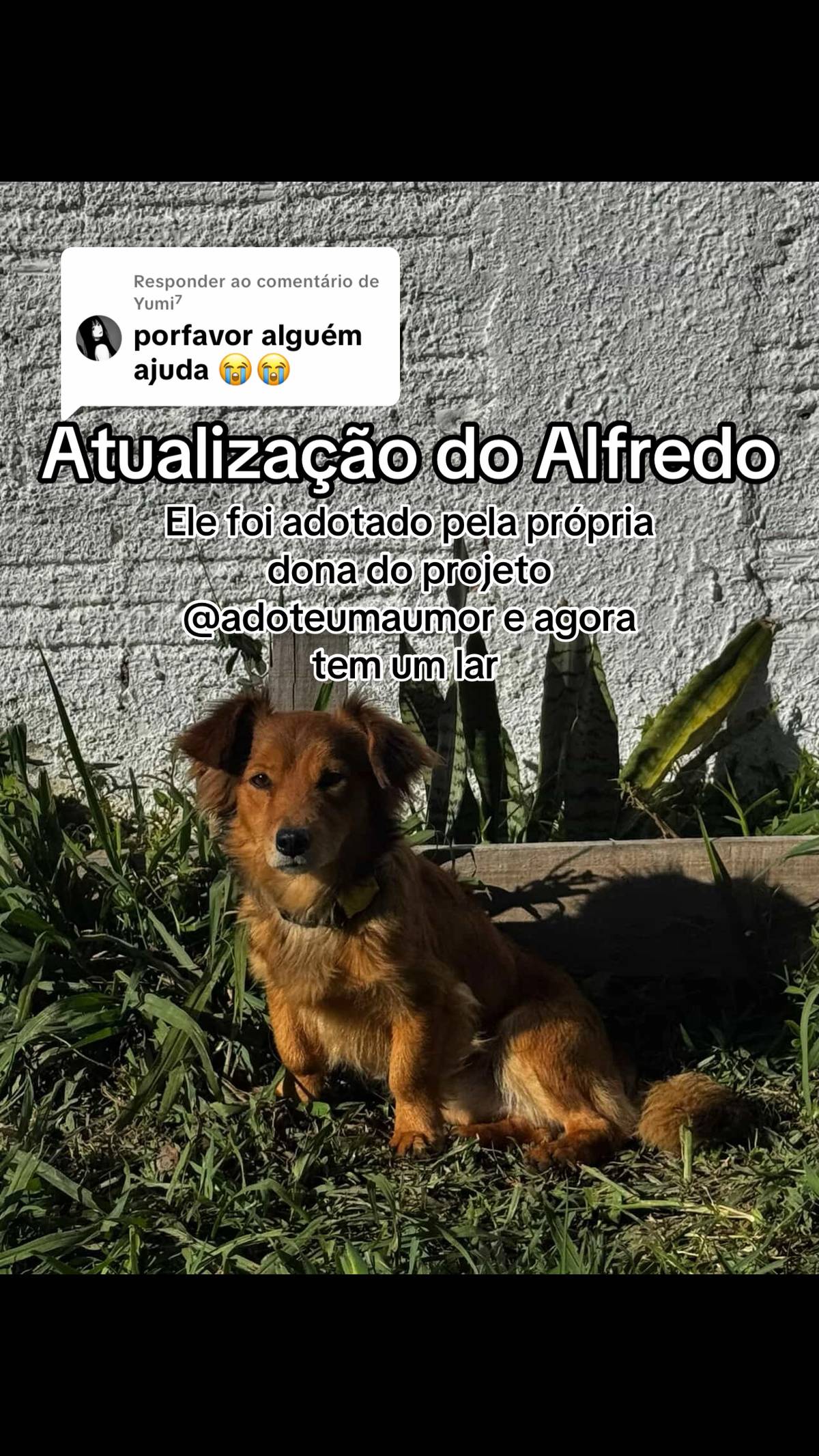 A trajetória de Alfredo ganhou um desfecho feliz em 1º de setembro, quando a coveira compartilhou uma foto anunciando que ele havia sido adotado pela própria responsável pela ONG.