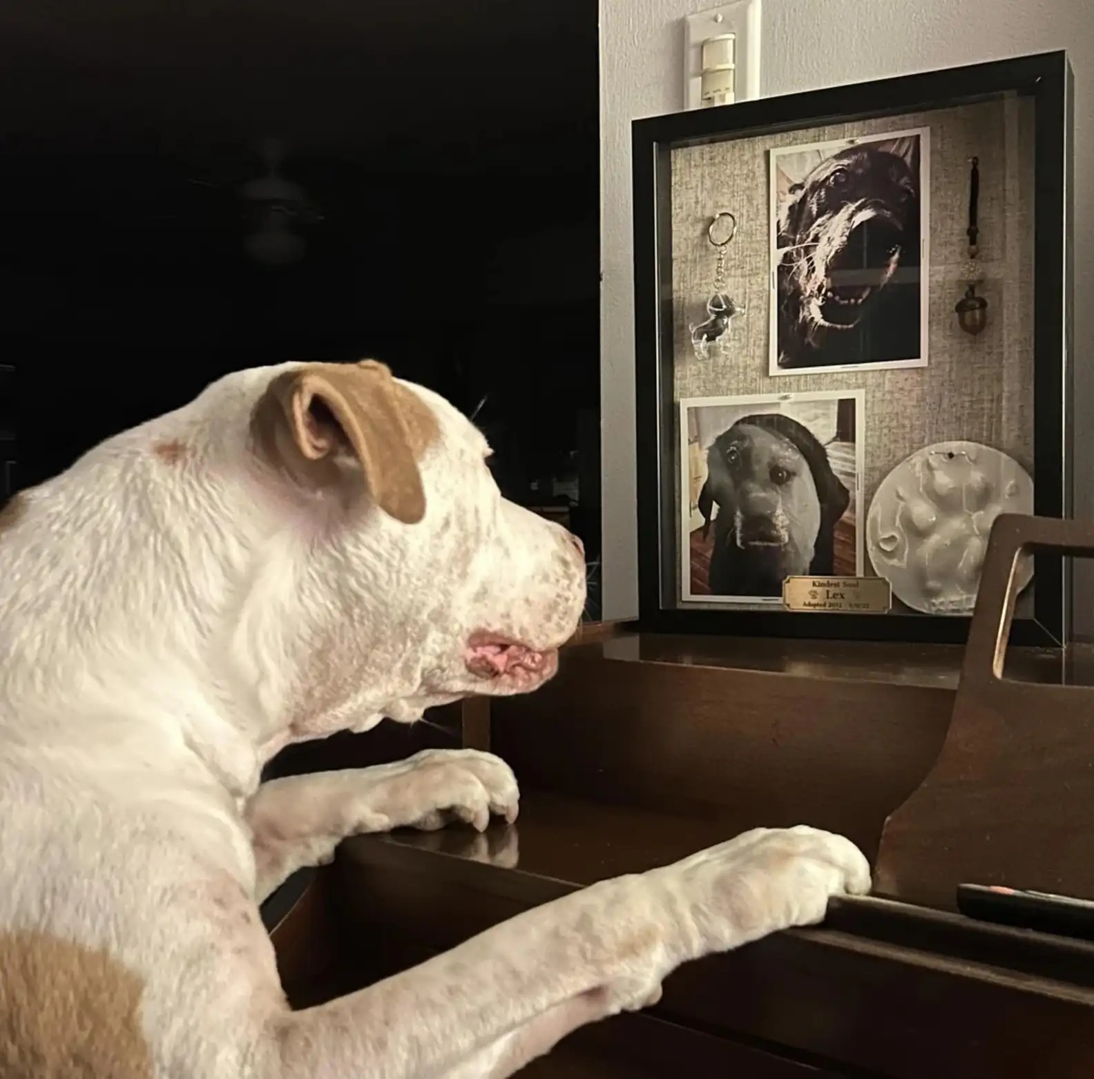 O memorial, que nasceu como forma de preservar lembranças, acabou se tornando também um espaço de afeto para o cão sobrevivente.