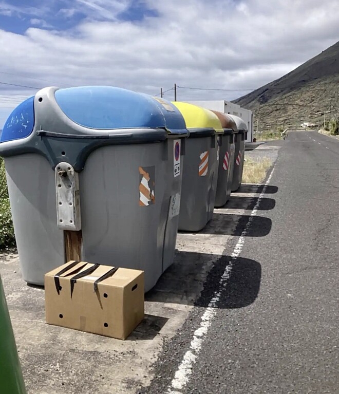 Mas, ao lado das lixeiras, algo lhes pareceu estranho: uma caixa de papelão lacrada com fita adesiva, com furinhos discretos nas laterais.
