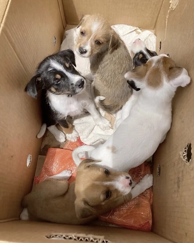 A curiosidade virou espanto quando abriram a tampa. Lá dentro, cinco filhotes de cachorro, encolhidos, os encaravam com olhos assustados.