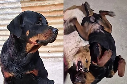 Cão de rua oferece ajuda para rottweiler abandonado que não sabia atravessar a rua e cena comove