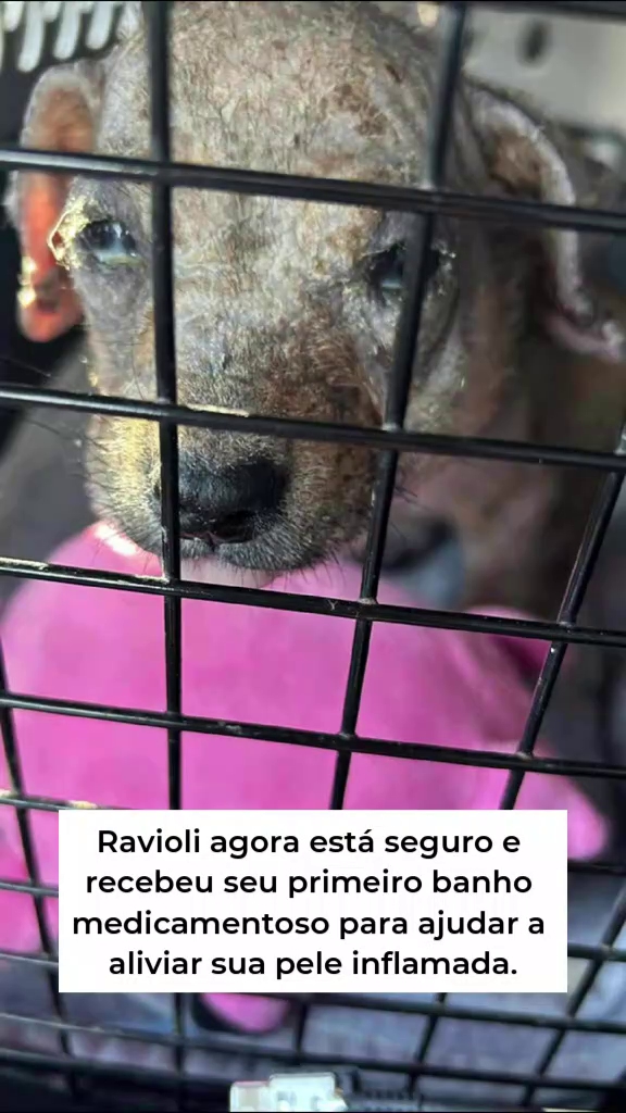 "Certa vez, ele foi abandonado no calor do Texas para morrer... Quando resgatado, Ravioli lutava contra infecções, sarna e dores inimagináveis", detalha o texto da publicação.