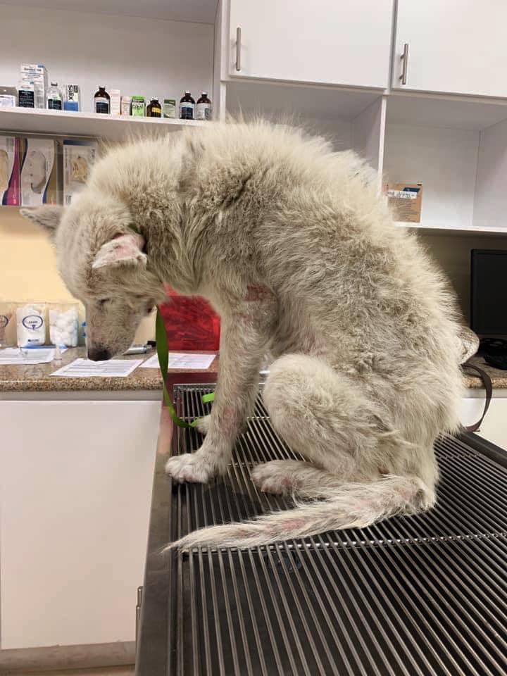 O caminho para a recuperação começou na mesa de um veterinário. O diagnóstico confirmou a severa infestação de sarna e revelou a provável causa de sua cabeça inclinada.