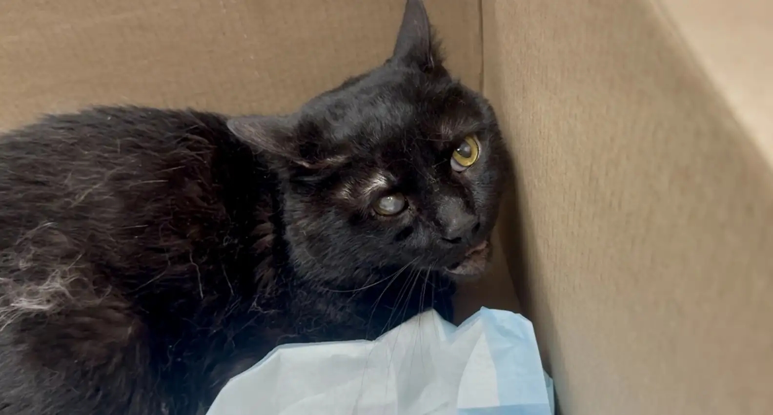 A gerente correu para dentro, arrancando a fita com as mãos trêmulas. Lá estava ele, um gato preto idoso, sujo, com os pelos emaranhados e os olhos opacos. Respirava, mas mal. Ele estava cansado e frágil.