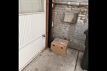 Atrás de duas grandes latas de lixo, ela avistou uma caixa de papelão lacrada com fita adesiva.