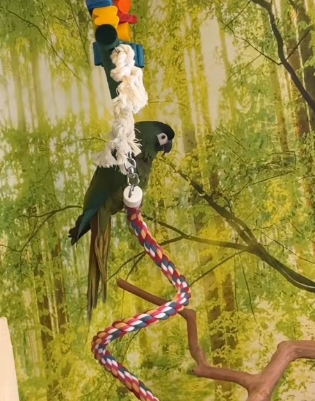 A tutora contou que, com o passar dos dias, a ave começou a explorar o ambiente ao redor. Duas semanas depois, Jasmine descobriu que tinha cômodo próprio: um quarto inteiro adaptado para seu bem-estar, com papel de parede de floresta, troncos, brinquedos e uma fonte d’água.