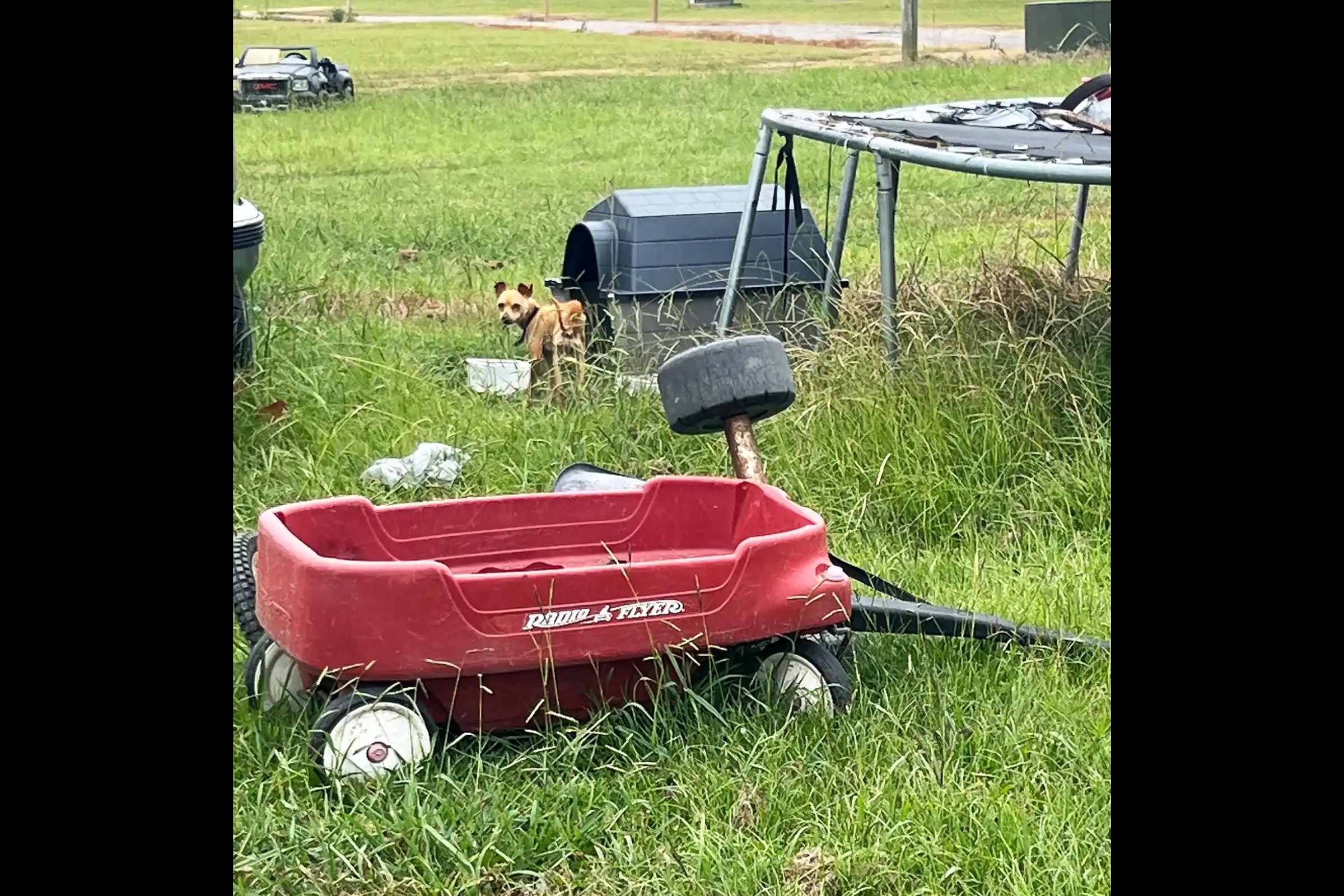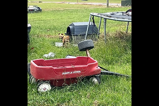 “Vi o Chico acorrentado a um velho trampolim com apenas 60 centímetros de corda emaranhada”, relembra Roos. “A maioria dos trailers estava abandonada, e dois outros cães próximos mostravam comportamento agressivo, resultado da frustração de ficarem constantemente sozinhos.”