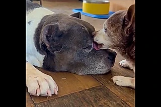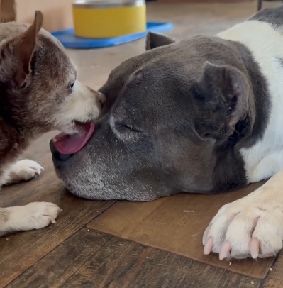 Chihuahua idoso decide que agora é 'pai' de uma pitbull gigante e todos dias aplica ritual de skincare na 'filha'