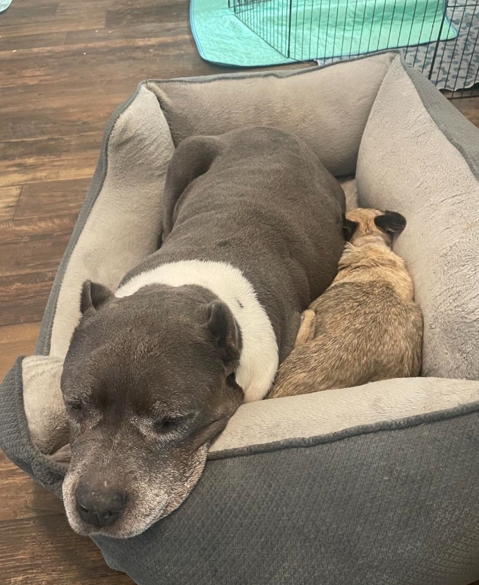 Apesar da diferença de tamanho, idade e energia, eles formaram uma dupla inseparável e formam um dos vínculos mais adoráveis do abrigo.