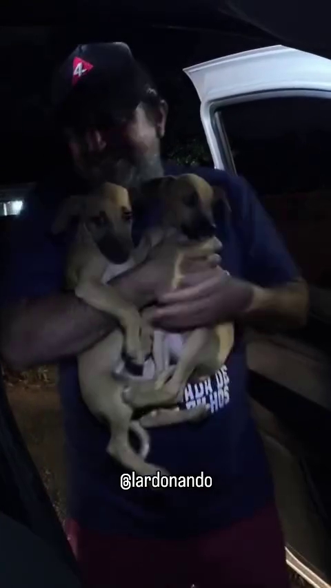 "Eu com 2 dentro do carro e me aparece mais dois". A frase revela que Fernando já estava em uma missão, transportando outros animais resgatados.