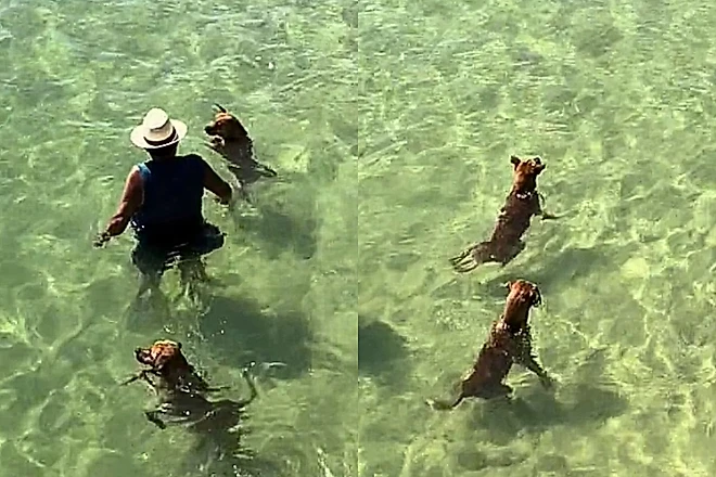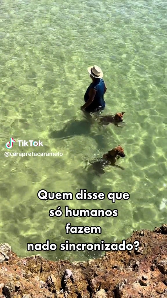 Publicado no perfil do TikTok @carapretacaramelo em 1º de julho de 2024, o vídeo mostra a dupla de atletas de quatro patas nadando em perfeita harmonia ao lado de um homem.