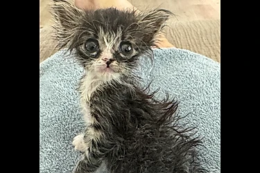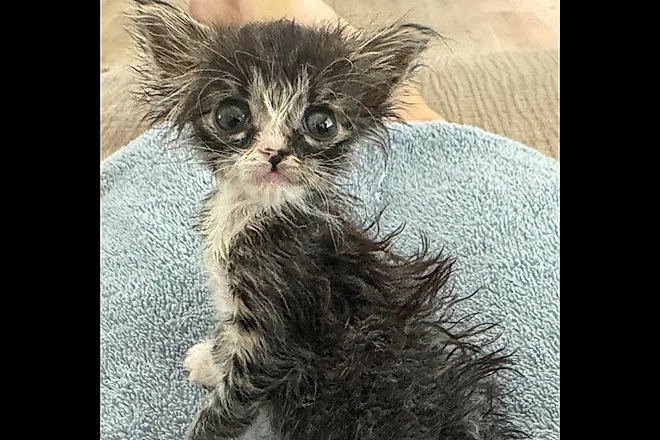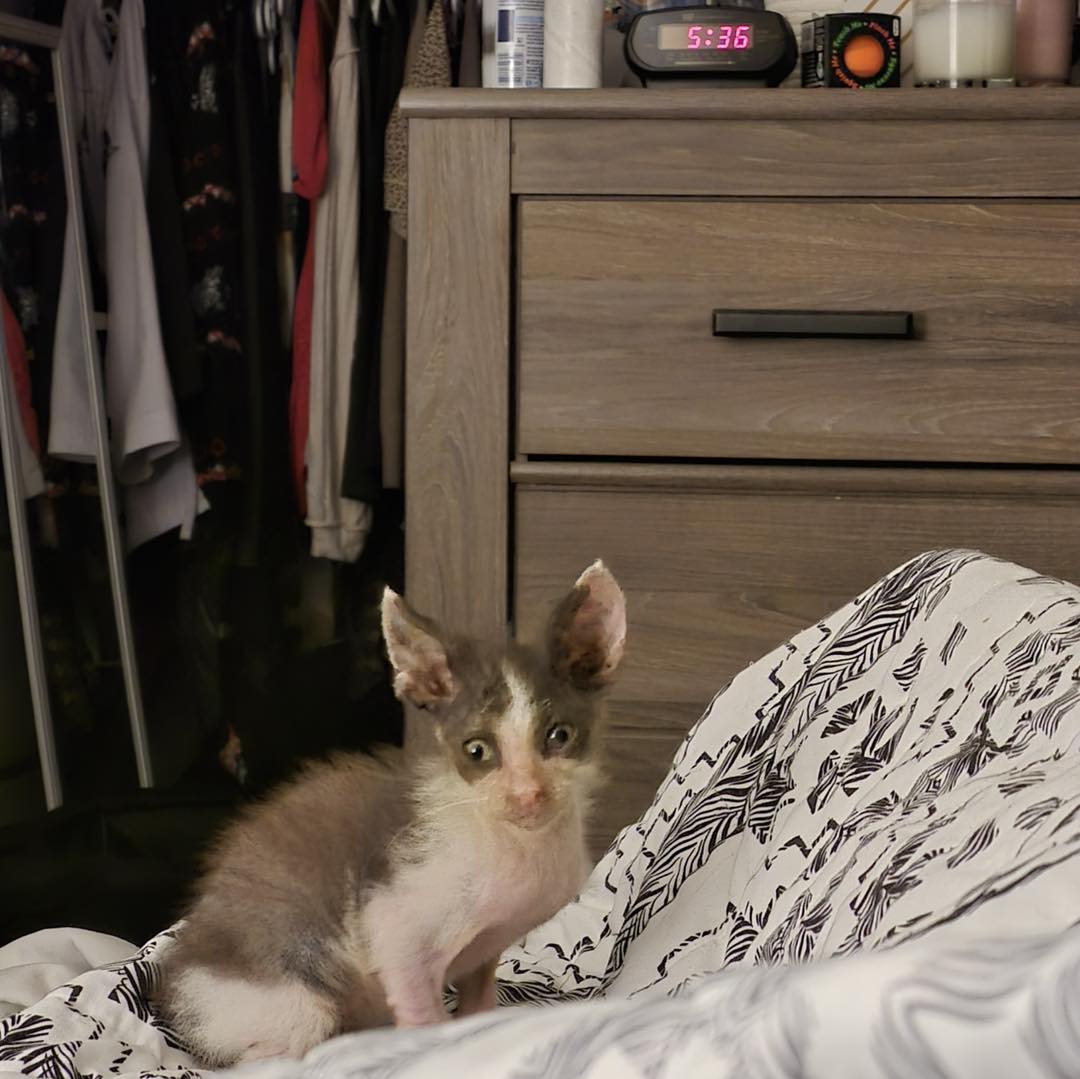 Encontrado sozinho em um parque de trailers, com cerca de sete semanas, ele estava sujo, desnutrido e lutando contra uma infecção fúngica que afetava sua pele e seus pelos. Ainda assim, mostrava uma vontade de viver impressionante.