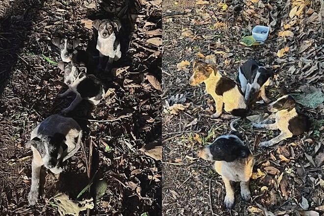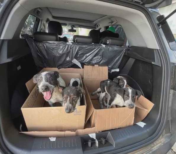 Ao se aproximarem, perceberam que não era um galho ou um pedaço de lixo, mas uma ninhada de cãezinhos magros, assustados e claramente abandonados.
