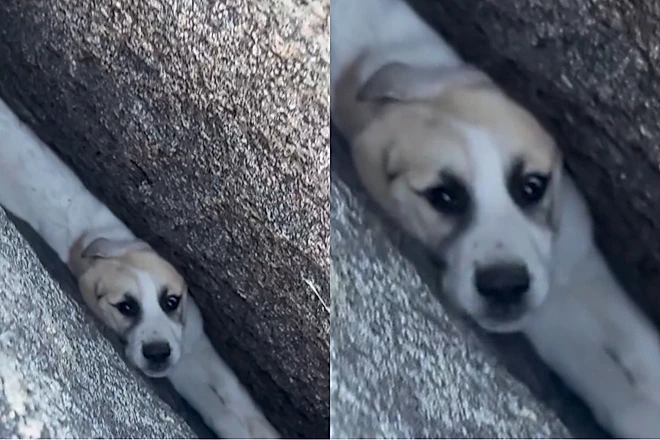 Socorristas encontram cachorrinha chorando após serem acionados para resgatar pet presa entre pedras grandes