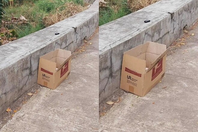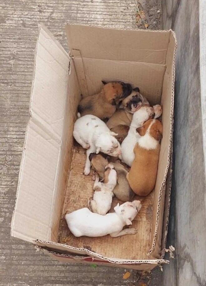 Quando abriram a caixa, se depararam com nove filhotes de cachorro, todos abandonados.