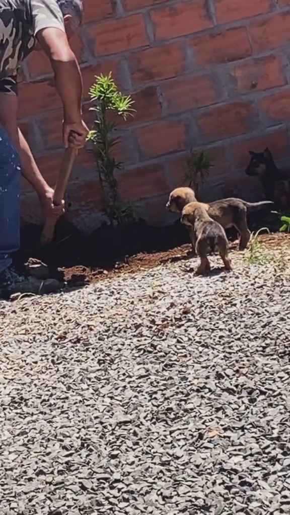 Os filhotes parecem gravitar em torno do tutor, tratando sua atividade de jardinagem como o evento mais importante do dia.