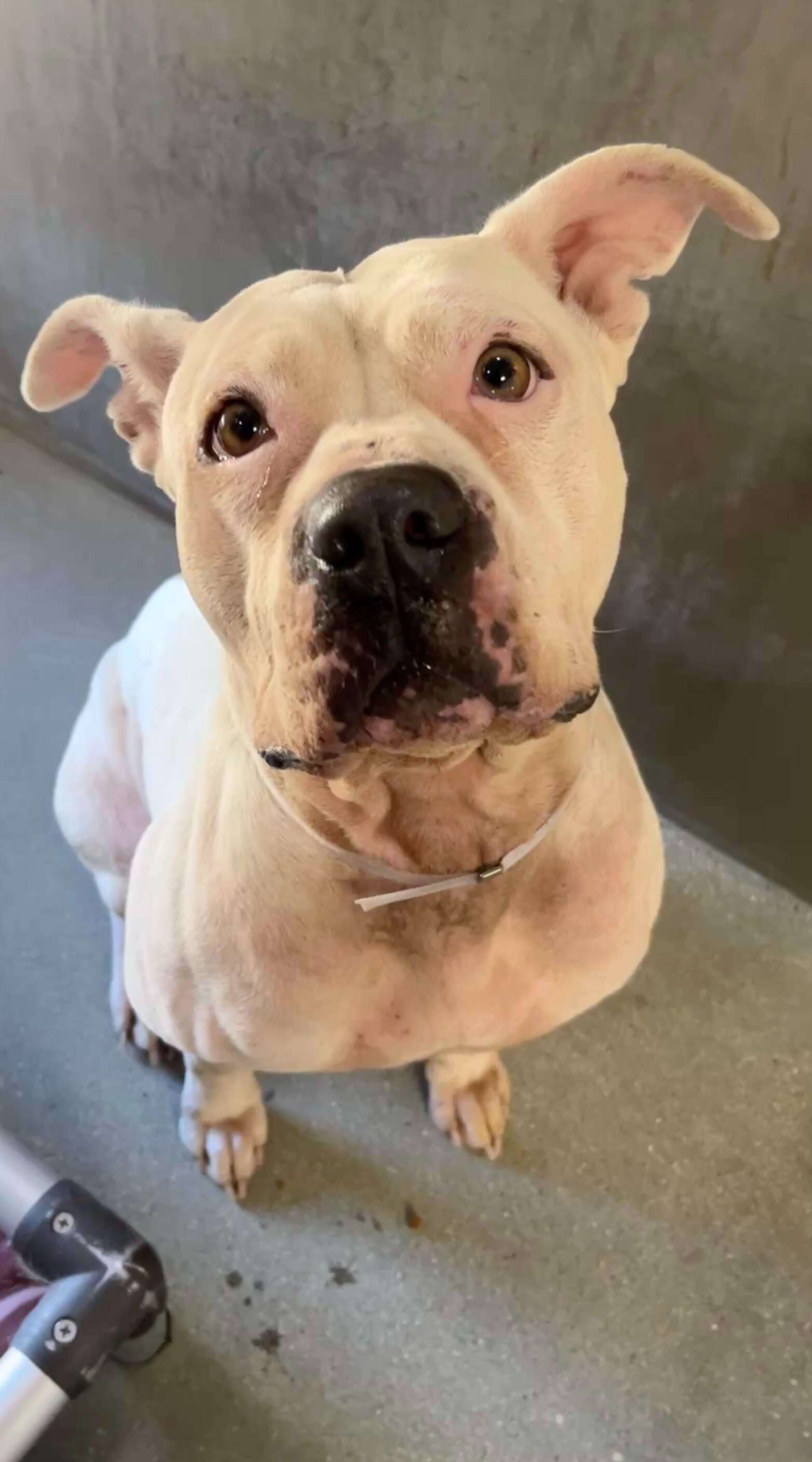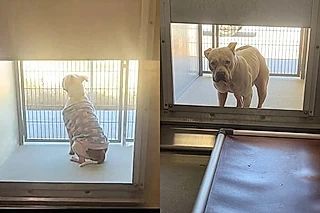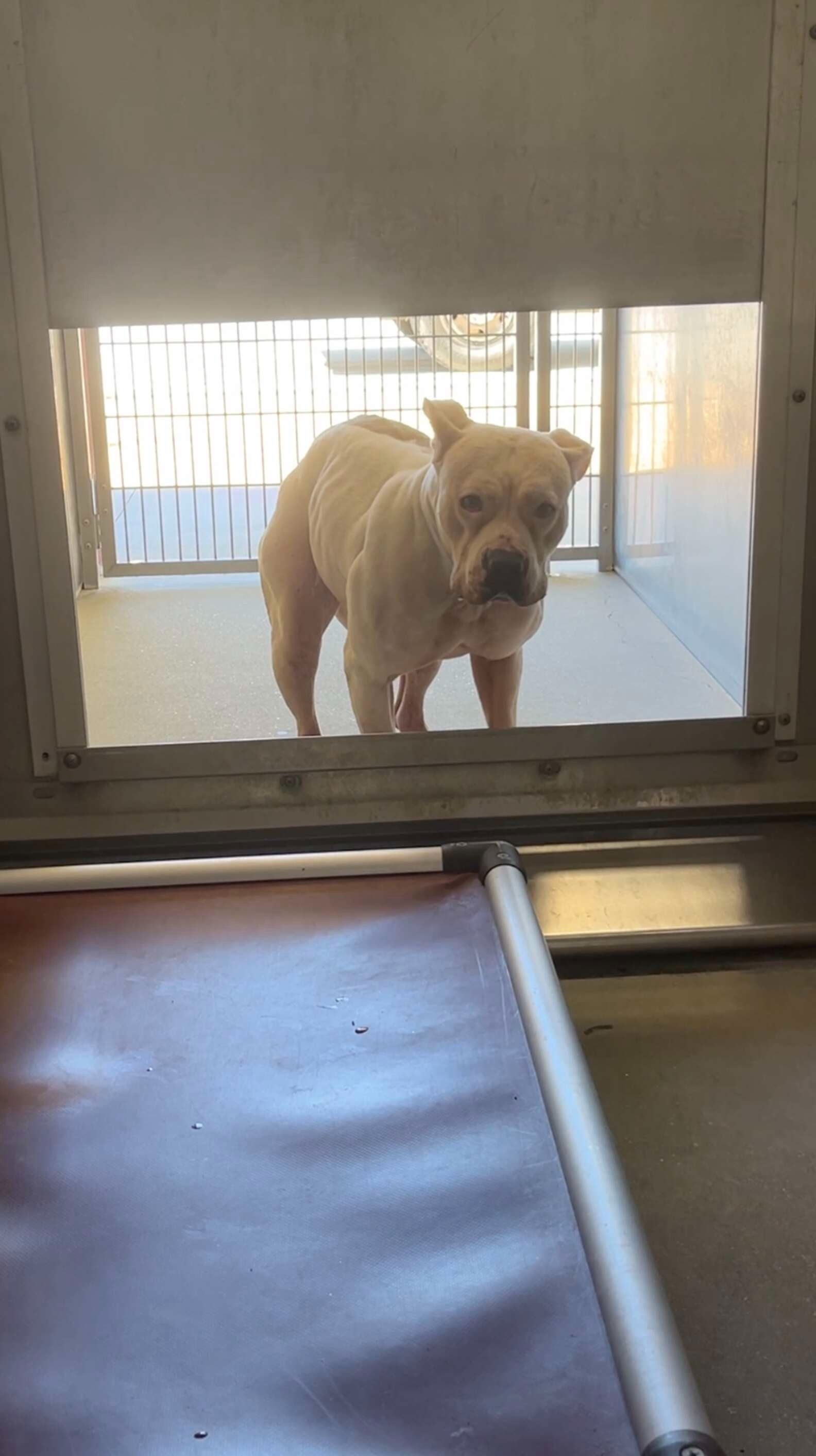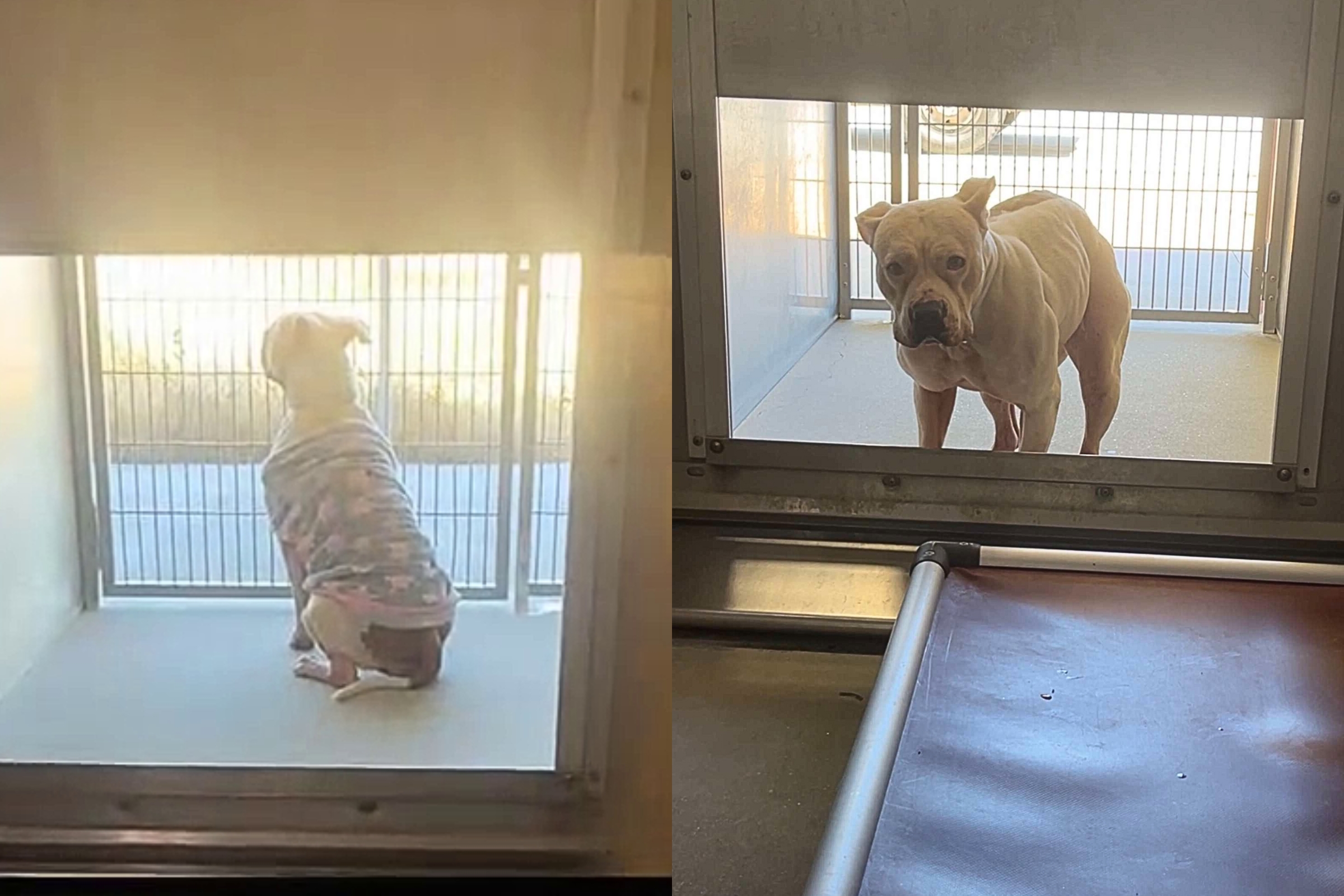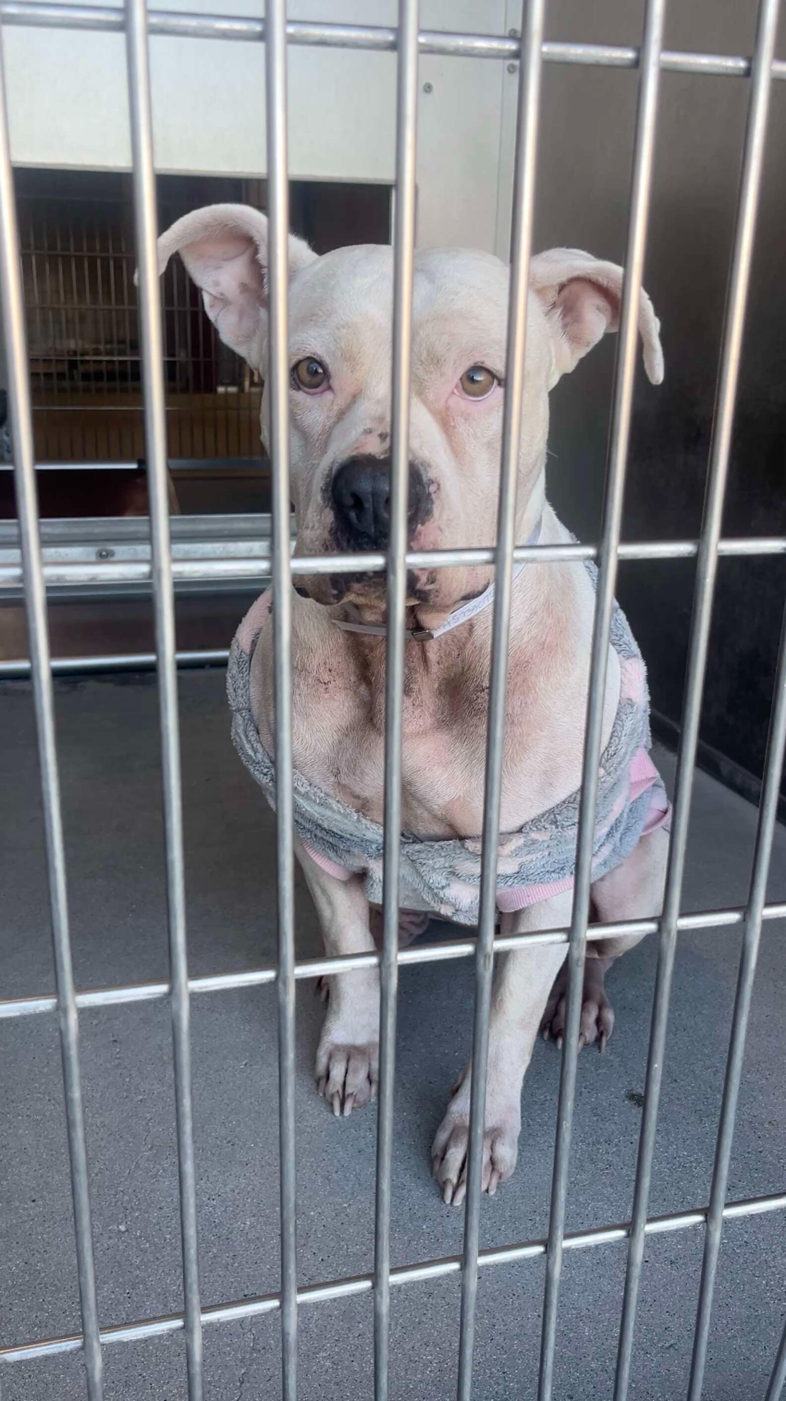 A chegada de Korra ao Lancaster Animal Care Center foi silenciosa e tensa. Um vídeo publicado no Tik Tok mostra a cadela em um canil de metal, usando uma roupa estampada.