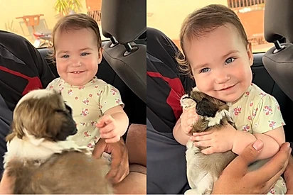 Assim que seus olhinhos curiosos avistaram o cachorrinho, ela abriu um sorrisão espontâneo, esticou os bracinhos para pegá-lo no colo e o envolveu em um abraço cheio de ternura.