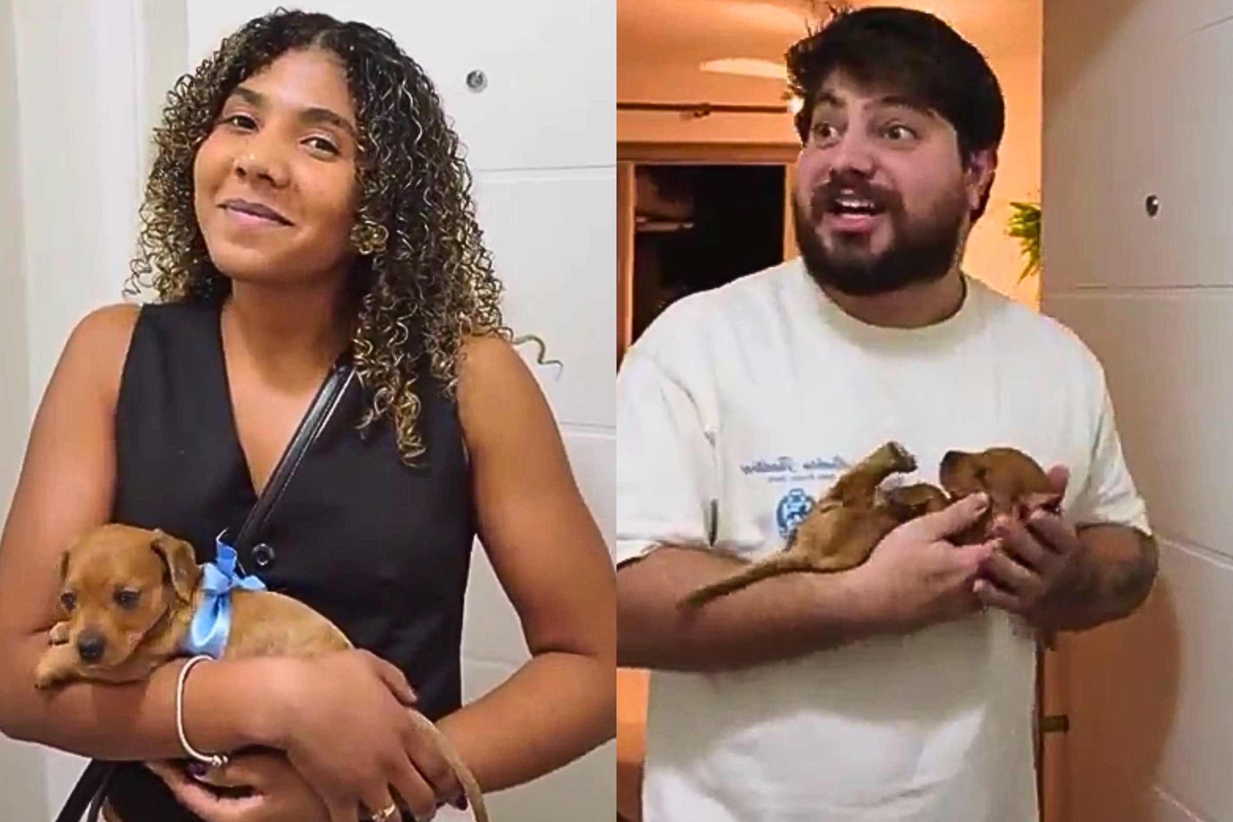 O registro, gravado pela própria esposa, começa com ela segurando o filhote de pelagem caramelo na porta de um apartamento.