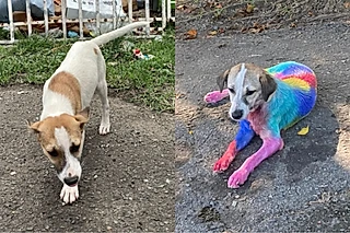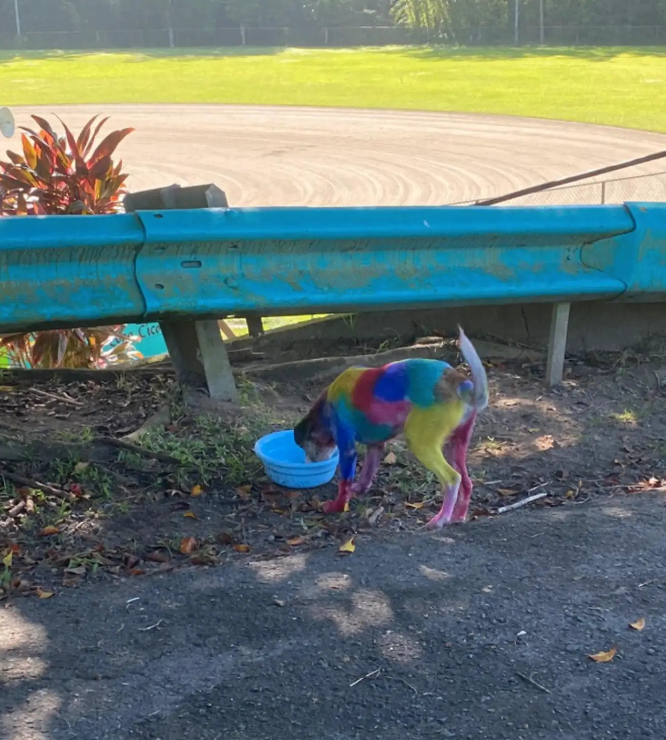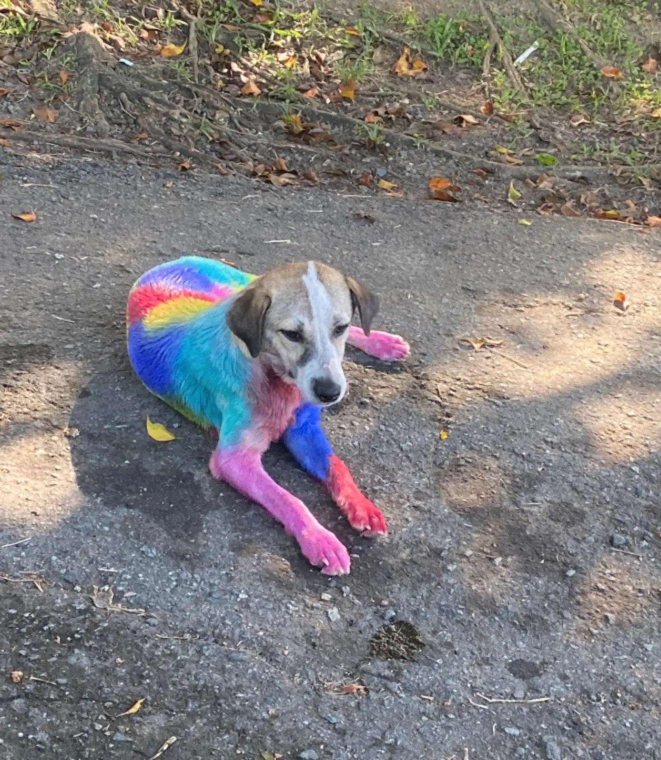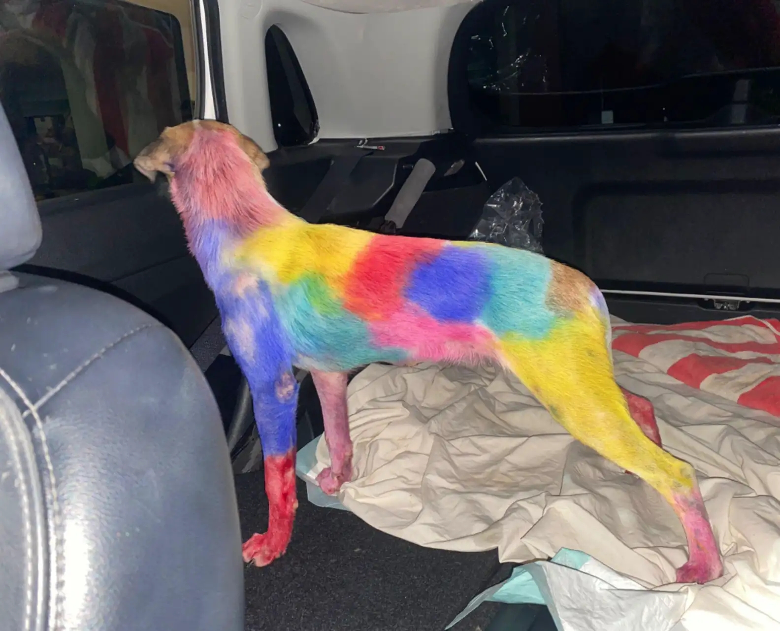 Cadela de rua desaparece — dias depois, reaparece coberta de tinta colorida