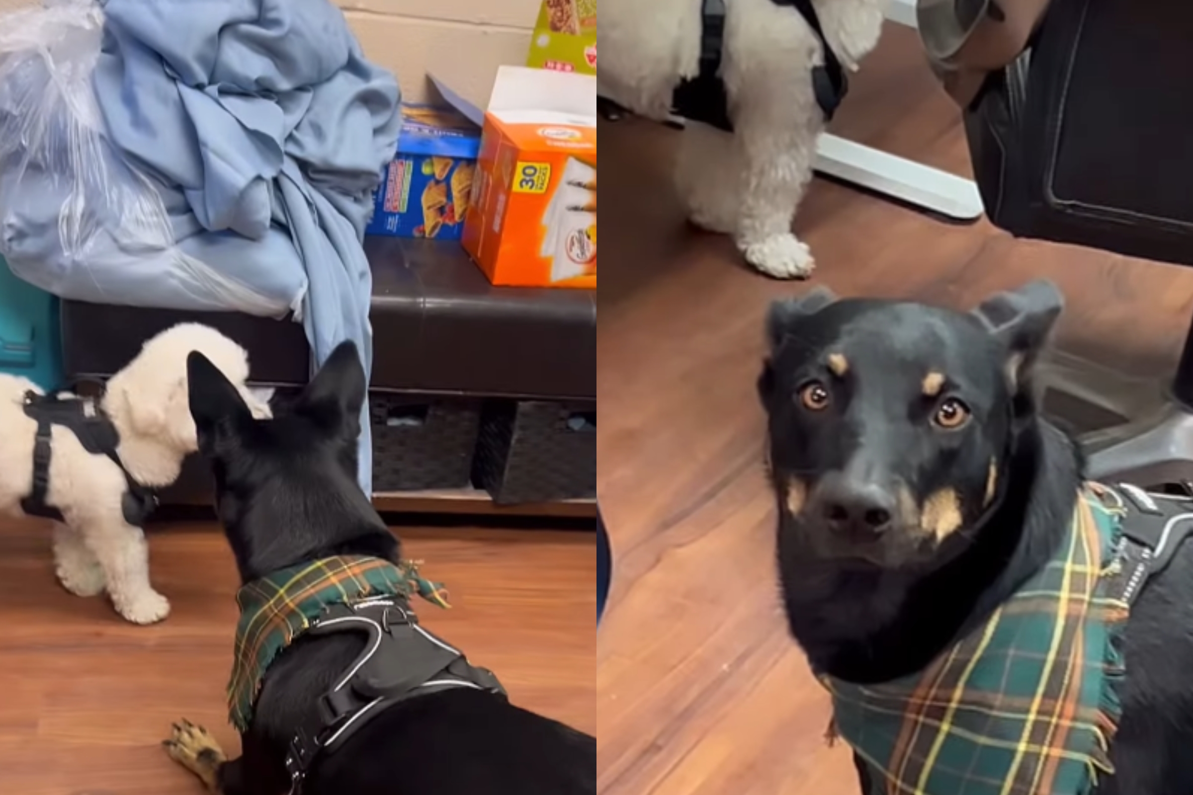 O vídeo, publicado no Instagram em 27 de setembro, mostra o cão empenhado em cumprir sua “missão”, mesmo que a colega de quatro patas não fizesse ideia do que estava acontecendo.