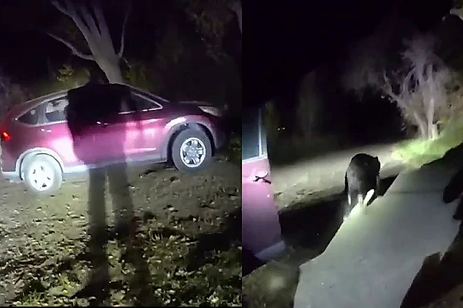 Em um salto repentino, um enorme urso saiu de dentro do veículo, surpreendendo todos os presentes e transformando a tensão da madrugada em puro espanto.