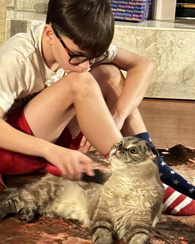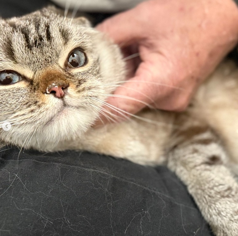 “Assim que abrimos a caixa, ele se aconchegou no colo de um dos nossos cuidadores”, disse Kimberly. “Era um gato doce e muito tranquilo, com aquelas orelhinhas dobradas que fazem qualquer um se derreter.”