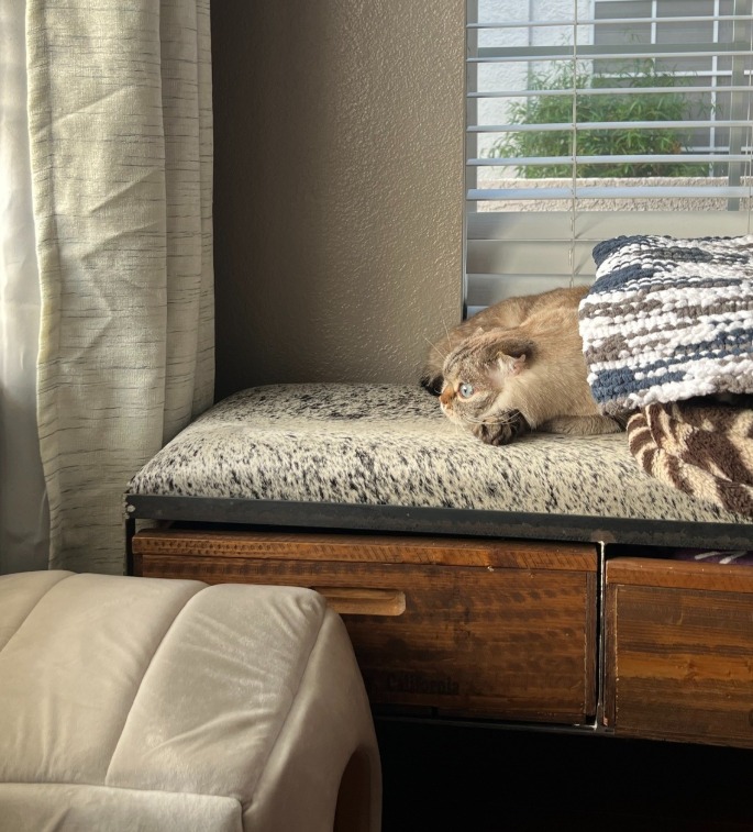 Desde então, o Scottish Fold está se adaptando bem à nova rotina. Ainda se esconde de vez em quando, um comportamento comum após uma mudança brusca, mas já ronrona com frequência e demonstra estar cada vez mais confiante.