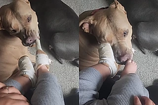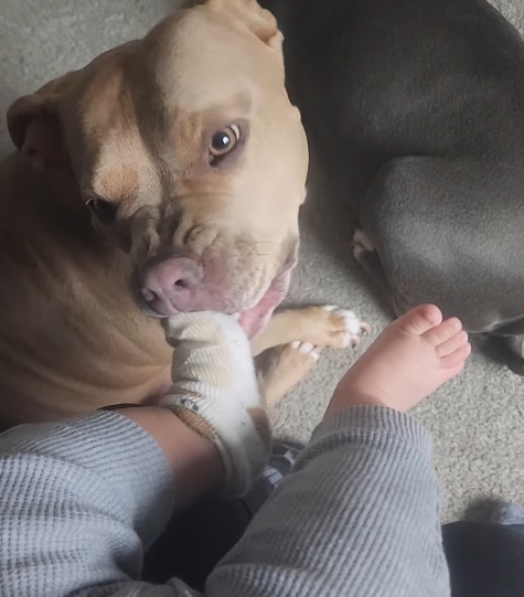 Pitbull apaixonada por 'bisnaguinhas' tira meias de irmão humano com carinho e promove cena mais fofa de todas