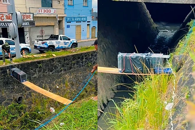 Com a ajuda de uma prancha de madeira, eles montaram uma armadilha segura para resgatar a gatinha. Duas pessoas, posicionadas em lados opostos do canal, seguravam a prancha com o auxílio de cordas firmes, descendo-a cuidadosamente até o ponto onde a felina estava abrigada.