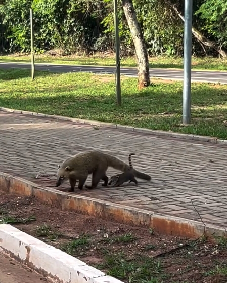 “Quem nunca tropeçou na vida, né? Essa família de quatis atravessando o Parque dos Poderes deu um show de fofura. Campo Grande e seus encantos!”, dizia a legenda.