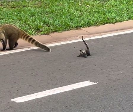 Uma mamãe quati tentava atravessar a rua com seu filhote… um pequeno completamente distraído, atrapalhado e curioso.