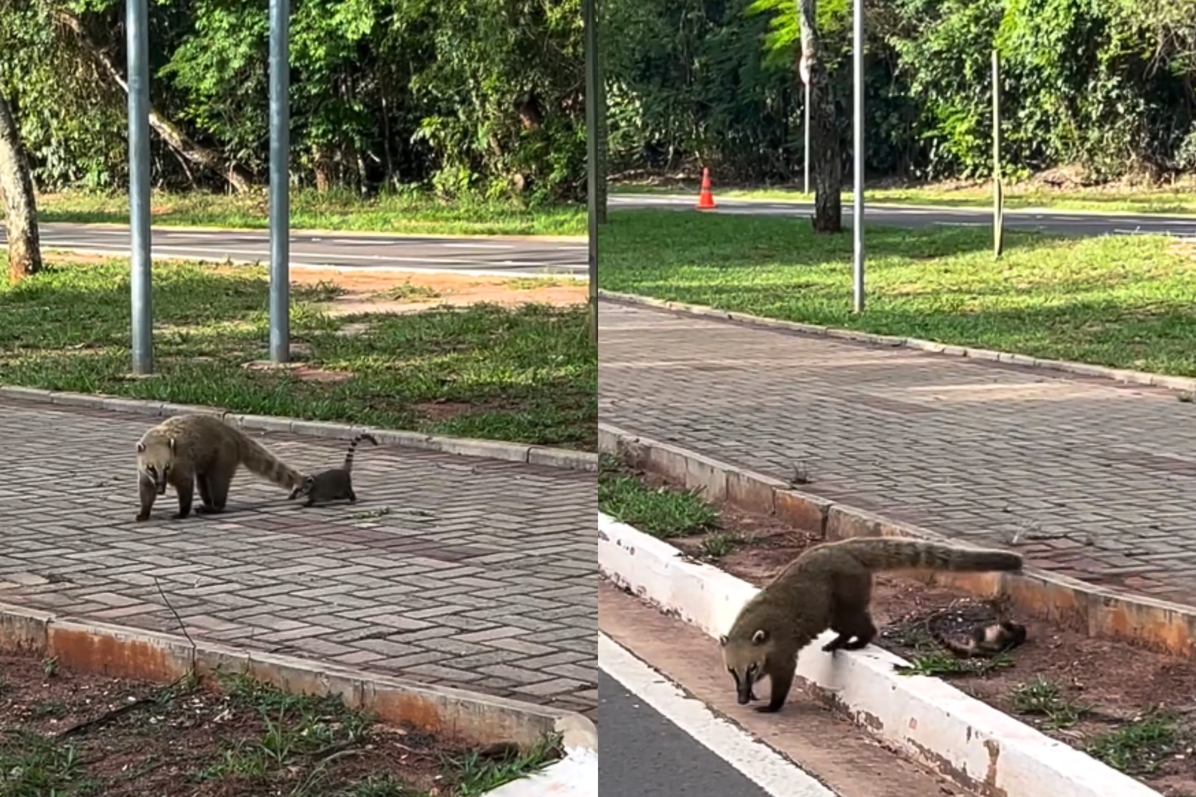 Em MS, pedestre flagra como mamãe quati trata filhote que caiu no caminho e carinho da cena encanta