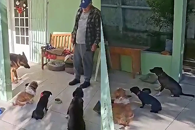 Ele agora compartilha a rotina com seus quatro cães residentes e um "visitante" frequente. A prática se consolidou e os novos membros aprendem observando os mais velhos.