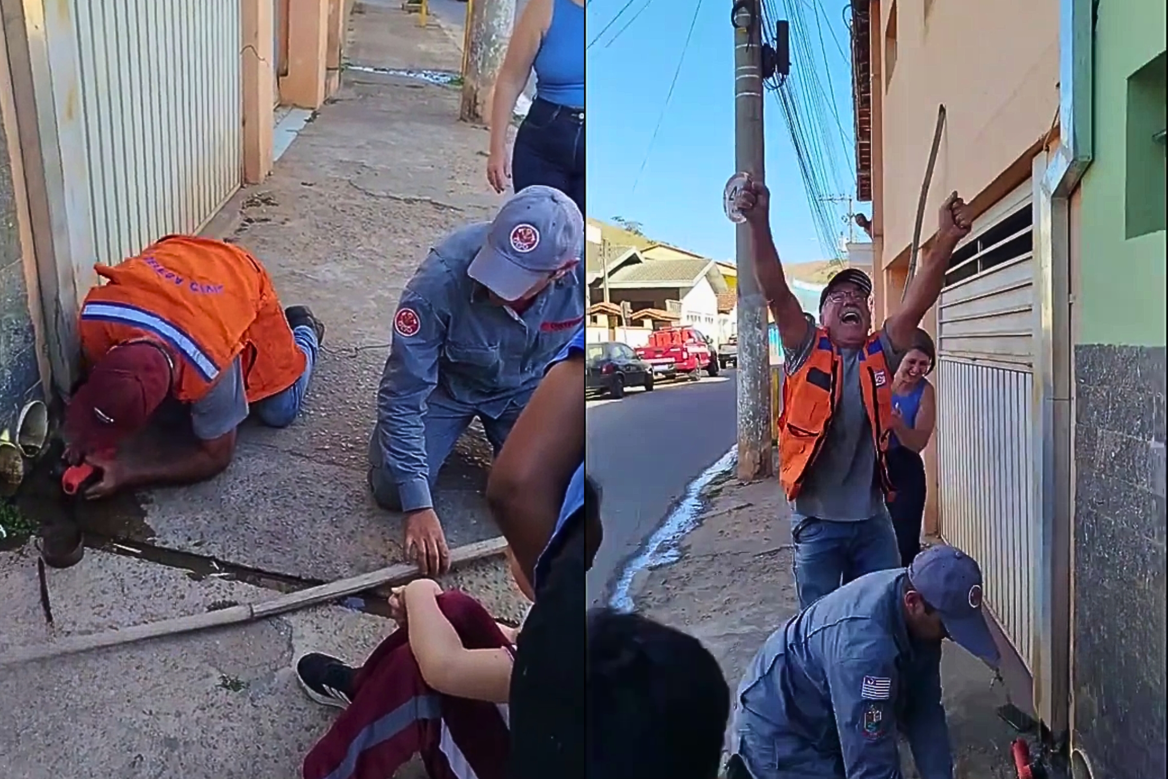 Após 2 horas de tensão, senhor desaba ao finalmente tirar cachorro preso em cano