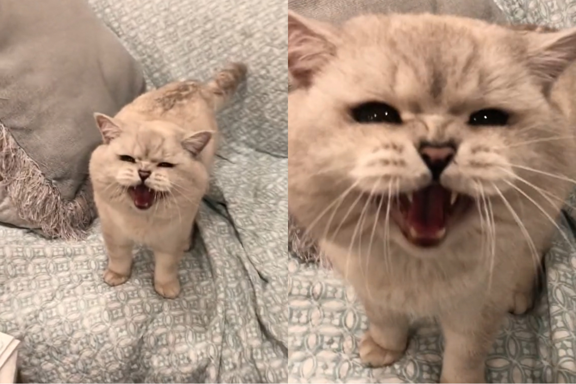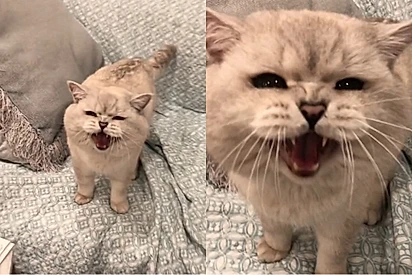 Depois de alguns segundos, ele começa a emitir pequenos miados tímidos, quase como se estivesse aquecendo a voz para uma apresentação.