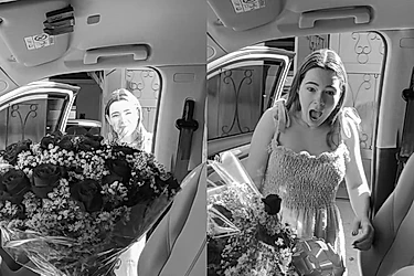 Ao abrir a porta do carro, Cecília se deparou com um buquê enorme de flores. O sorriso veio imediatamente, ocupando o rosto todo.