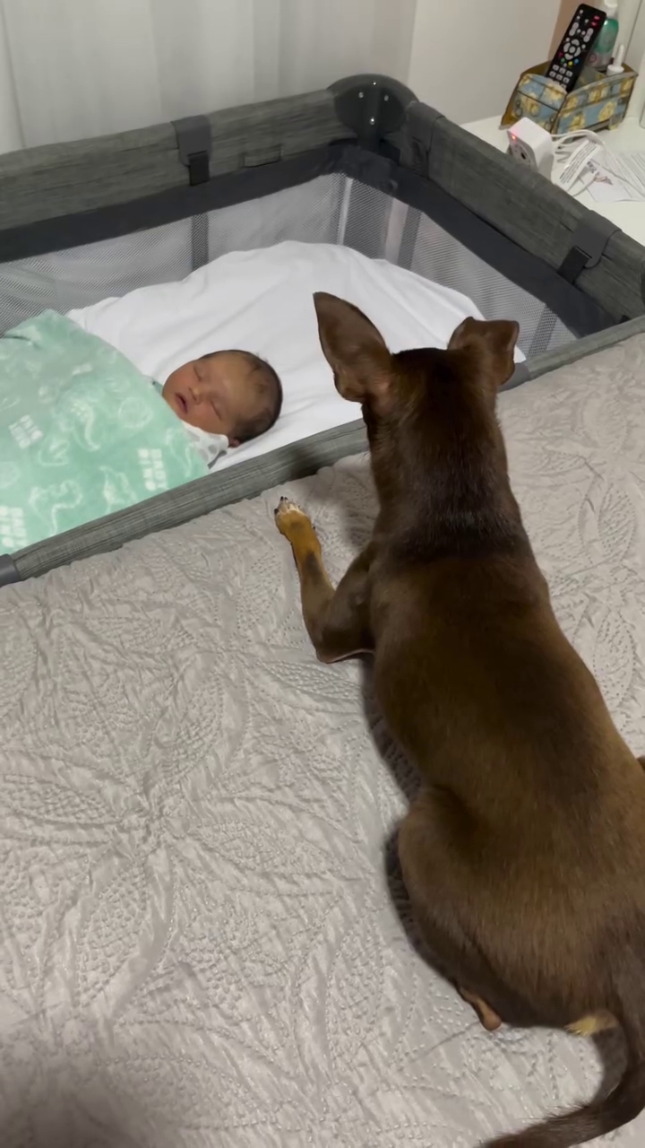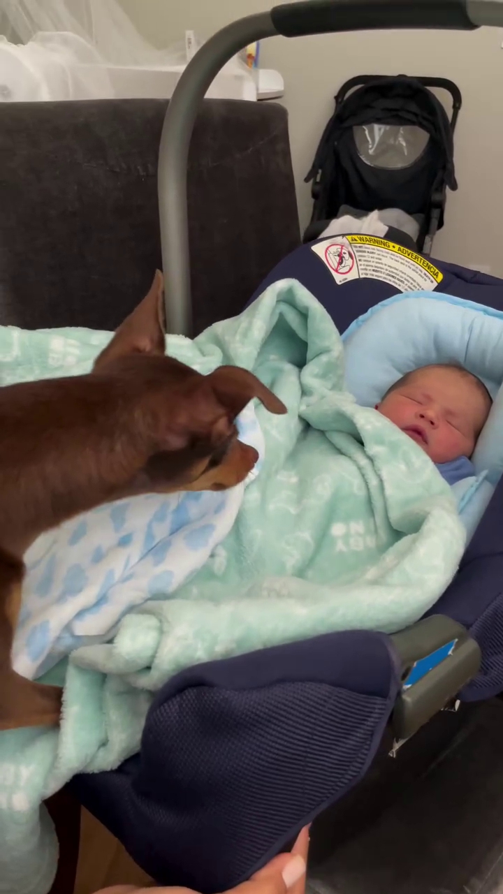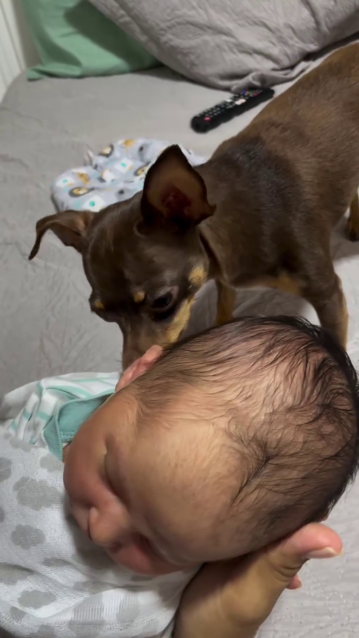 'Oi, mini-humano': Cão pinscher recebe recém-nascido com todo cuidado e delicadeza e cena encanta tutora