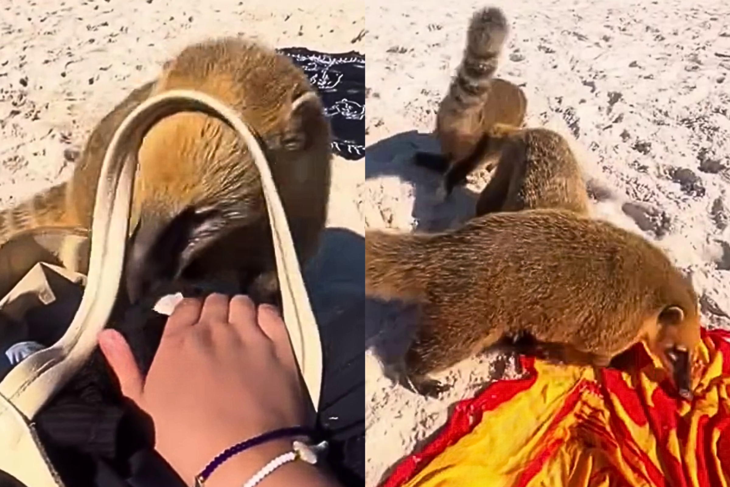 A gravação mostra a reação da mulher ao ser cercada pelos mamíferos, que pareciam determinados a encontrar algo na bolsa deixada na areia.
